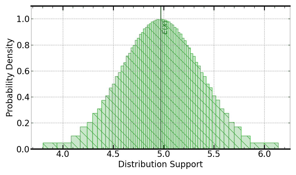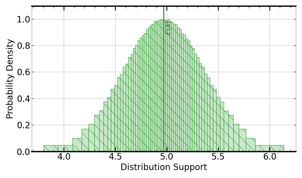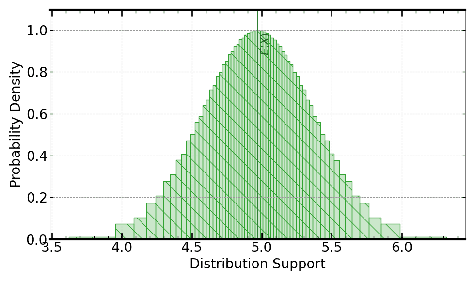 Plot of the output of an 7.9M-iteration Monte Carlo for this use case. This Monte Carlo iteration count provides the same or better Wasserstein distance to ground truth (20M-iteration) Monte Carlo as execution on a Signaloid C0Pro-XL+ core (which is 28.8x faster).