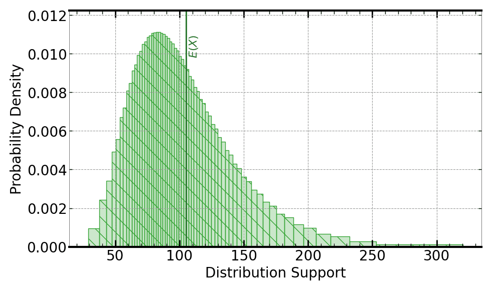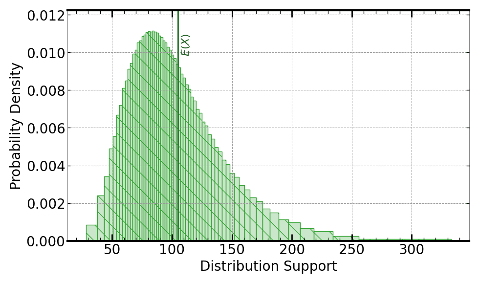 Plot of the output of an 2.6M-iteration Monte Carlo for this use case. This Monte Carlo iteration count provides the same or better Wasserstein distance to ground truth (20M-iteration) Monte Carlo as execution on a Signaloid C0Pro-XL core (which is 12.5x faster).