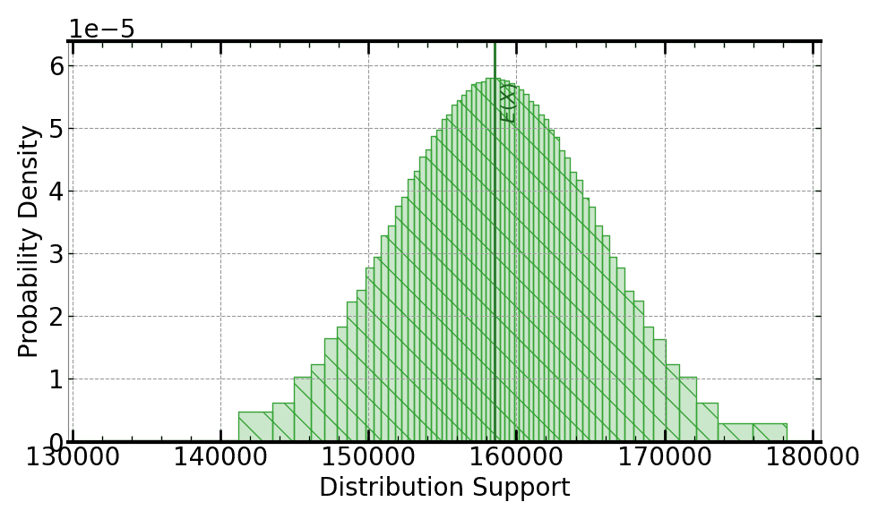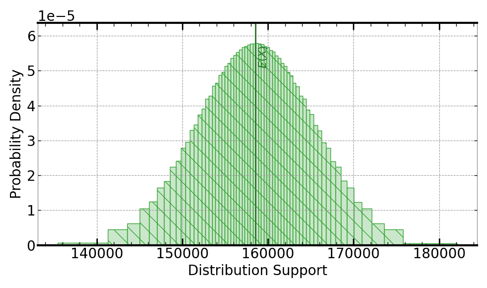Plot of the output of an 17.3M-iteration Monte Carlo for this use case. This Monte Carlo iteration count provides the same or better Wasserstein distance to ground truth (20M-iteration) Monte Carlo as execution on a Signaloid C0Pro-L core (which is 466x faster).