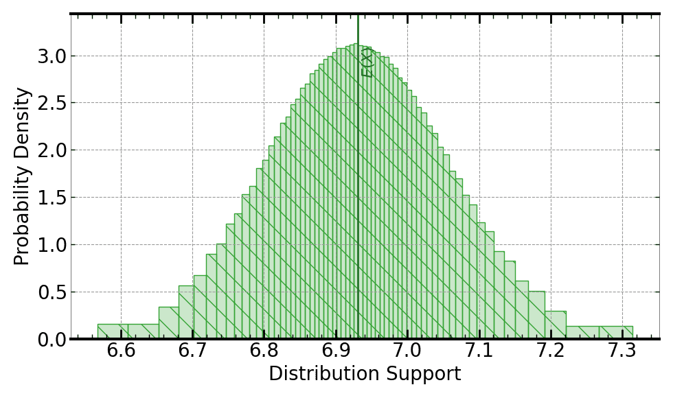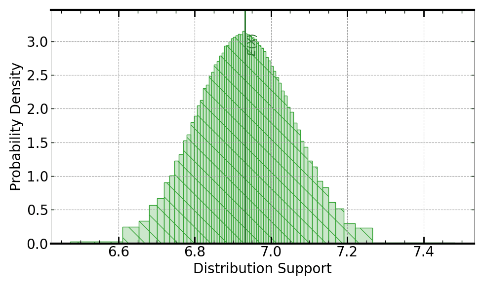 Plot of the output of an 22.2M-iteration Monte Carlo for this use case. This Monte Carlo iteration count provides the same or better Wasserstein distance to ground truth (large, converged) Monte Carlo as execution on a Signaloid C0Pro-M+ core (which is 583x faster).