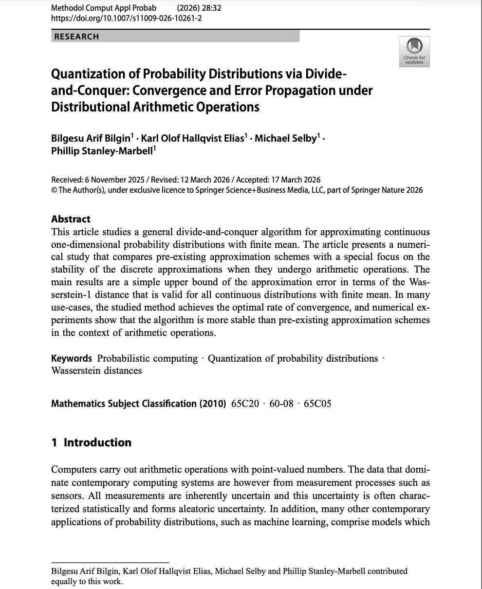 Bilgin, Bilgesu Arif, Karl Olof Hallqvist Elias, Michael Selby, and Phillip Stanley-Marbell. "Quantization of probability distributions via divide-and-conquer: Convergence and error propagation under distributional arithmetic operations." Methodology and Computing in Applied Probability 28, no. 2 (2026): 32.